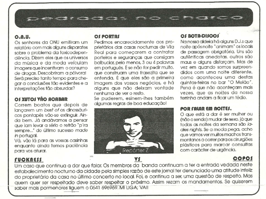 Neste ponto da história, os locais repetem-se. O Ex Bar da reportagem do Sons do Silêncio era um dos locais preferenciais para a distribuição do jornal S.O.N.A.R. Afixado anonimamente em sítios estratégicos, as duas páginas coladas na parede evoluiriam mais tarde para 4 páginas num formato portátil, distribuído em mão – isto porque as pessoas começavam a arrancar as folhas das paredes para guardarem a publicação. Por trás do jornal estava Pedro Botelho (aka Pe7er Panic), a quem mais tarde se juntou Pedro Carvalho, conhecido por Finas. Em conversa com o Panic, ele diz-me que poderão ter havido mais colaboradores, no entanto, já não se recorda. Fazia a composição gráfica em casa, onde também imprimia, até ter conseguido um patrocínio à impressão. Nos cinco números a que tive acesso, e que muito provavelmente constituem a totalidade das edições lançadas, perfila-se uma escrita simples e descomprometida, mas acidamente crítica, sagaz e destemida. Tão destemida que o Repórter X, o Panic, chegou a sentir na pele (literalmente) a fúria de leitores descontentes. Tudo se tratou de uma polémica com a gerência do bar Copos & Rezas, na altura envolvidos num imbróglio com os Fuckness, quando a um dos membros foi recusada uma bebida depois de um concerto no dito bar. Obviamente, e como devem imaginar, o S.O.N.A.R era o sítio perfeito para travar todas estas guerras.