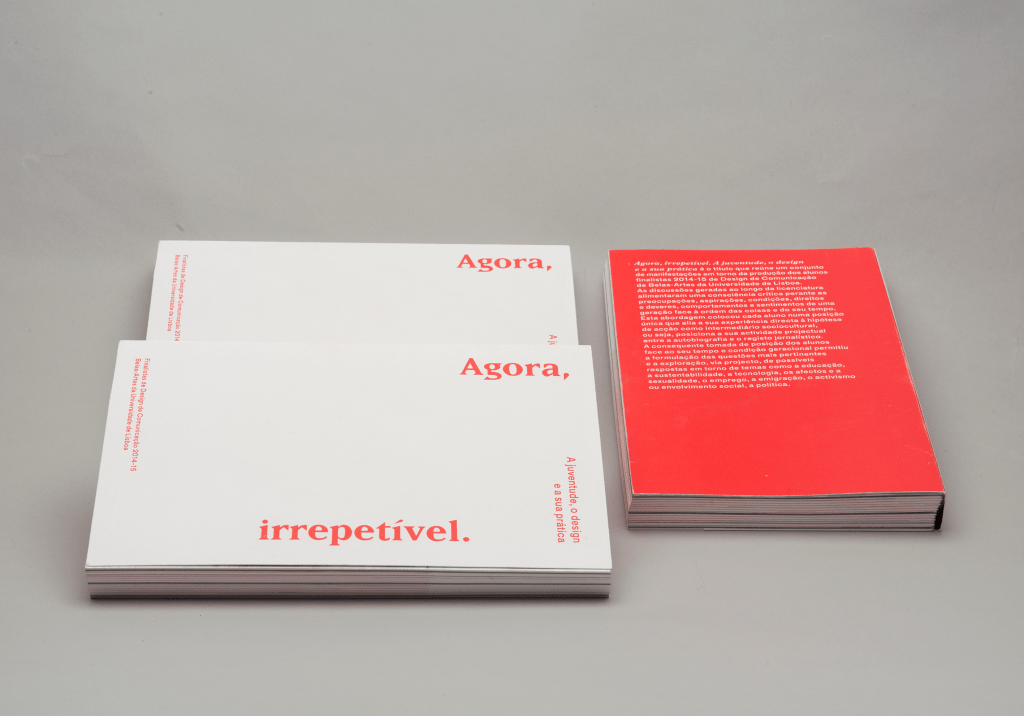 Este ensaio foi originalmente publicado em 2015 no livro dos finalistas de Design de Comunicação da Faculdade de Belas-Artes da Universidade de Lisboa. O livro fazia parte de uma série de iniciativas, como uma exposição, debates e um documentário, agregadas sob o título Agora, irrepetível.